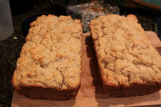 Last but not least. Beer Bread. A simple mix from Trader Joe’s (that they also sampled…) that you just mix with any 12 oz. beer. I first made this for Ben in addition to the homemade chicken noodle soup one day. And I’ve discovered it tastes much better with a stronger beer. The don’t remember what I used the first time but it was a dark beer. This time, I used a Belgian beer (it was all I had until everyone came over with Irish stouts…). Either way – this bread is DELICIOUS! It is incredibly hearty – dense and is crispy flaky on the outside (due to lots of butter you pour on the out side when you make it.