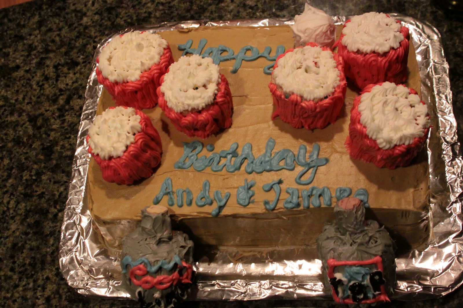 So this brings us to the current cake. This one comes with a disclaimer because it’s not my best work and not everyone “gets it”. I do also have to say that I am not a fan of what this cake represents. In fact – I can’t stand the game. It’s a long story. But any way – Andy and his brother James LOVE beer pong. So…I decided to make them a beer pong cake (which seemed fitting since they were having a beer pong tournament to celebrate their two birthdays. It didn’t really turn out how I envisioned…but….it worked for being an impromptu cake.