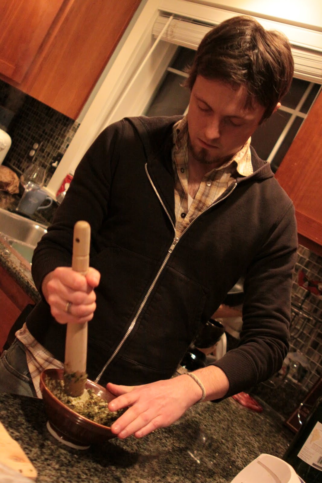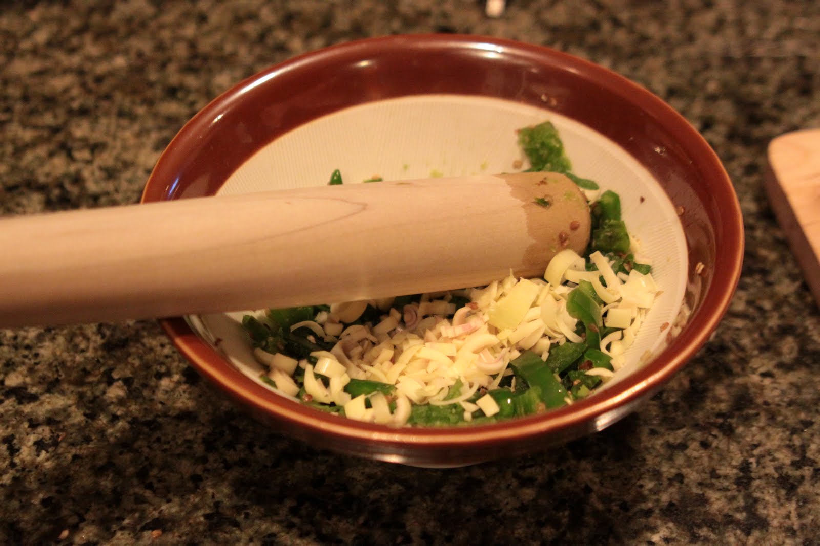 First, crushing the peppers and lemongrass to create a homemade curry paste (watch out for the fish paste…it’s not the most pleasant smell). I got tired of smashing, so I let Troy take over for a while.
