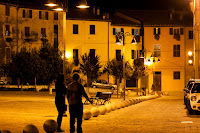 The house is beautiful and has a great view of the surrounding valleys and villages. We could hear band practice across the street (a group getting ready for the festival). I snuck over and peeked in. They were playing Al Green’s “I love you baby”….which is one of my favorite songs…it was great. Then we went to a bar (The Fashion Cafe) where I couldn’t find a good microbrew so i settled for a whiskey sour since they didn’t have gingerale. The place was weird. Again I probably should’ve taken photos but I was just so confused I didn’t even think about it. The upstairs has this funky club feel to eat. Purple walls, zebra photos, and barbershop/space chairs. There was another wall with some sort of pyschadellic indian mural. It was all rather confusing. And the music..the music was like instrumental karoke…and every other song was the complete opposite genre from the next. It was strange but we enjoyed some good conversation. Then Corrado met up with us and we had another drink back at the gelato shop. Here is a photo of grappe and Corrado’s reflection.